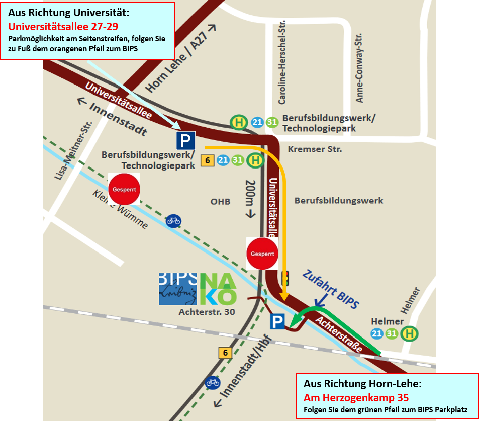 Wenn Sie unseren Parkplatz am BIPS nutzen möchten, können Sie die Zufahrt aus Richtung Horn-Lehe erreichen. Aus Richtung Universität nutzen Sie die Parkmöglichkeit an der Universitätsallee und gehen dann auf der Seite des Berufsbildungswerks entlang zum BIPS (ca. 500 m).